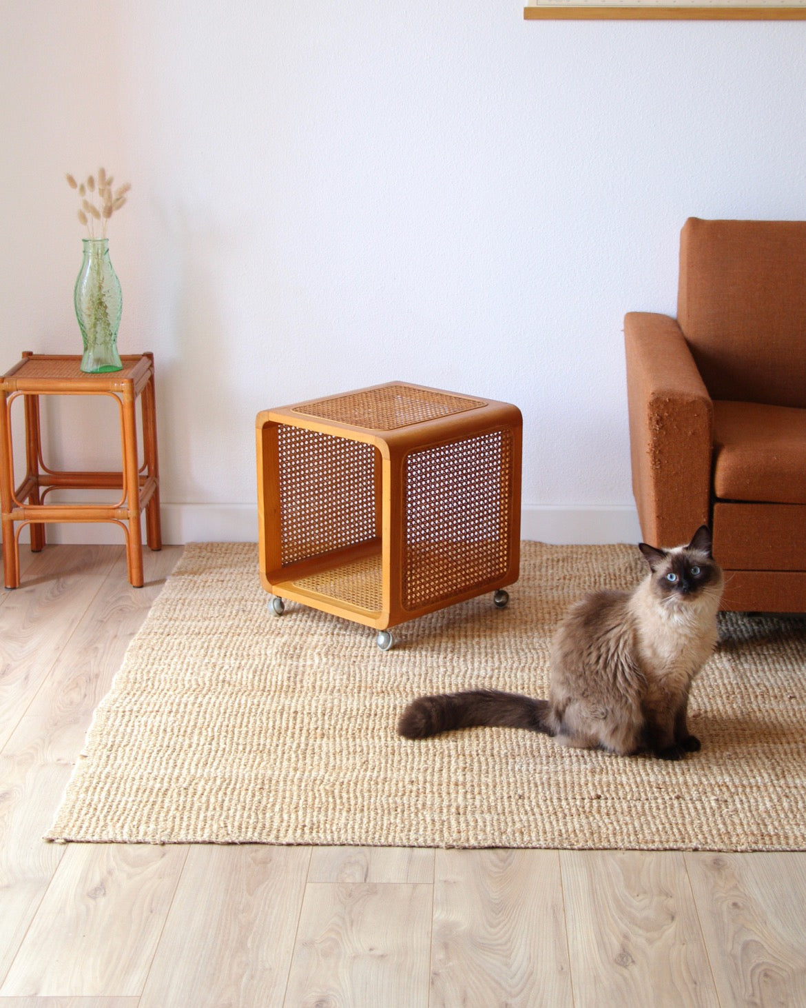 Joli petit bout de canapé ou table d’appoint en bois et cannage.